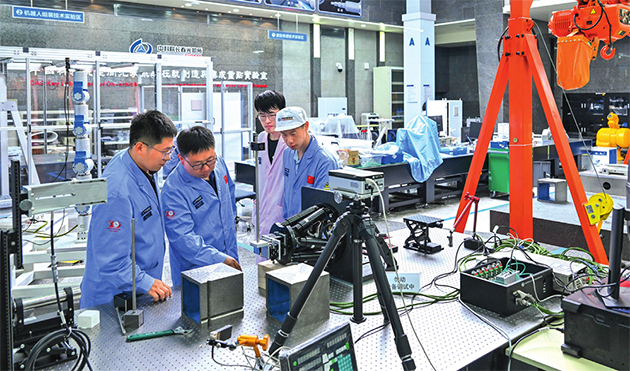 中國科學院空間光學系統(tǒng)在軌制造與集成重點實驗室副主任徐振邦(左二)與同事在實驗室內(nèi)討論科研工作(2023年5月25日攝) 許暢攝 / 本刊