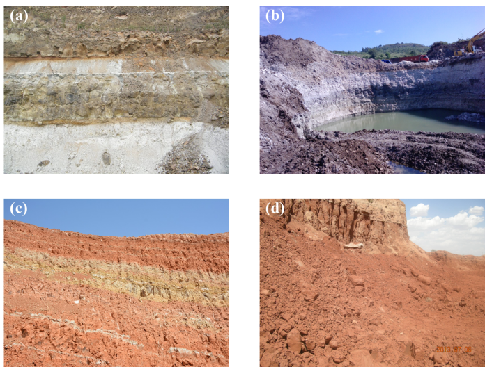 (a)安徽明光、(b)江蘇盱眙、(c)甘肅臨澤和(d)內(nèi)蒙古杭錦旗凹凸棒石礦山