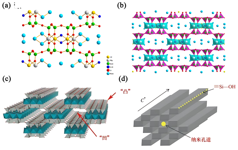 凹凸棒石晶體結(jié)構(gòu)(a, b)和孔道結(jié)構(gòu)(c, d)示意圖(圖片來源:中國科學院蘭州化學物理研究所)