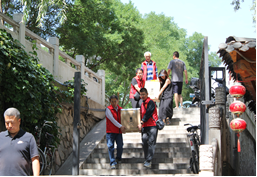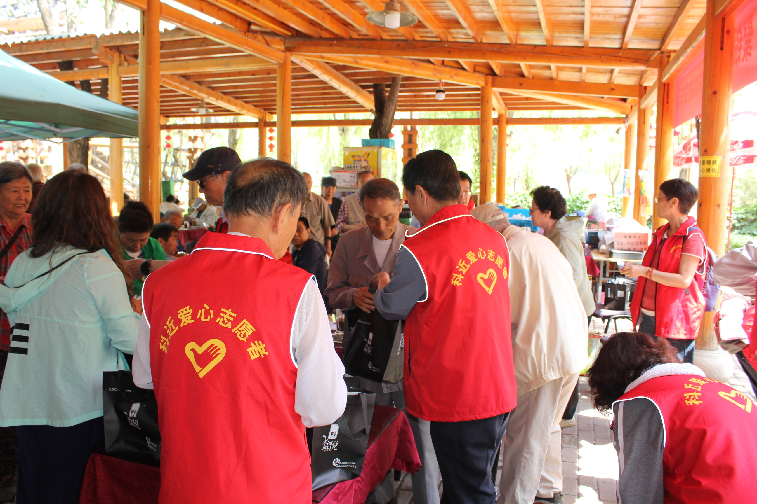 圖2:“科近愛心志愿者”服務(wù)隊的老年志愿者們身穿紅馬甲,和離退辦的同志們一起為大家服務(wù)