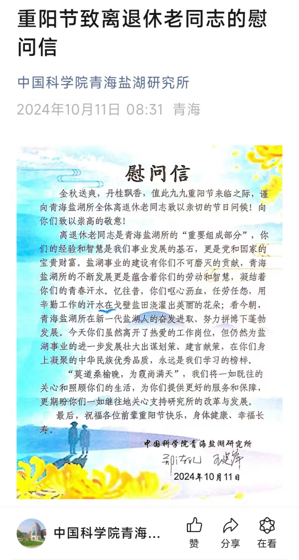 10月11日,在一年一度的重陽佳節(jié)來臨之際,為弘揚中華民族尊老、敬老、愛老、助老的優(yōu)良傳統(tǒng),中國科學院青海鹽湖研究所組織開展了重陽節(jié)關愛慰問系列活動,讓離退休職工在屬于他們的節(jié)日里感受組織的關心和節(jié)日的快樂。