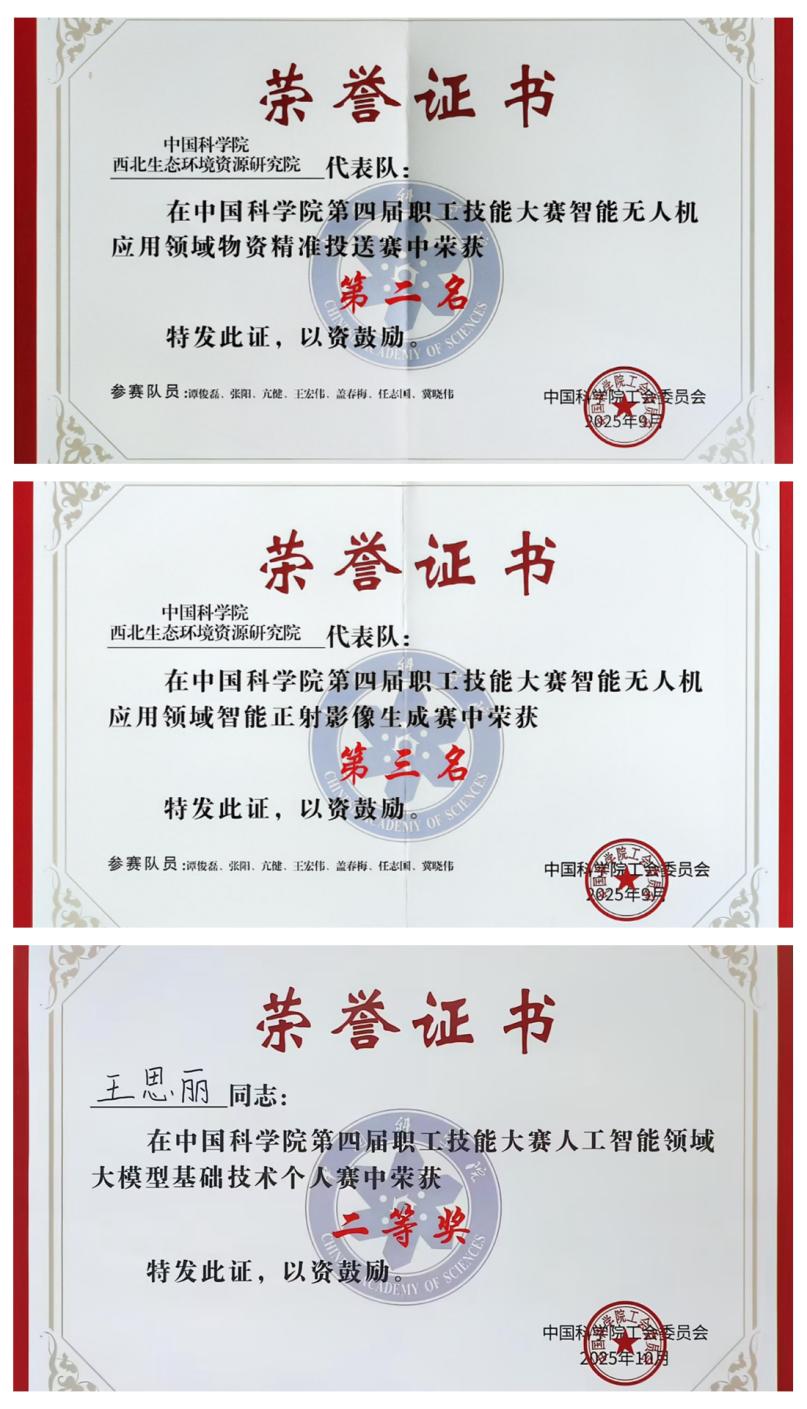 在西北研究院黨委的高度重視與工會的精心組織下,科研團隊積極響應(yīng)、踴躍參賽。智能無人機應(yīng)用領(lǐng)域,由黑河遙感試驗研究站譚俊磊、亢健、張陽等6名選手組成的團隊通過精準路徑規(guī)劃與動態(tài)負載調(diào)控,實現(xiàn)復(fù)雜環(huán)境下物資的穩(wěn)定投送,依托自研靶標識別程序,顯著提升正射影像數(shù)據(jù)處理效率,榮獲了“物資精準投送”賽道全院第二名,“智能正射影像生成”賽道全院第三名和團隊三等獎。在網(wǎng)信智能應(yīng)用服務(wù)領(lǐng)域,國家冰川凍土沙漠科學(xué)數(shù)據(jù)中心團隊將專業(yè)領(lǐng)域數(shù)據(jù)和服務(wù)能力與AI的強大分析推理能力結(jié)合,實現(xiàn)自然語言交互、數(shù)據(jù)智能分析和可視化展示,提升了數(shù)據(jù)中心的智能化服務(wù)水平,榮獲了“MCP云服務(wù)”賽道三等獎。在人工智能領(lǐng)域,文獻情報中心王思麗基于中國科學(xué)院 “磐石?科學(xué)基礎(chǔ)大模型”,圍繞人工智能基礎(chǔ)理論、實操能力與知識融合推理能力展開角逐,榮獲“大模型基礎(chǔ)技術(shù)個人賽”二等獎。