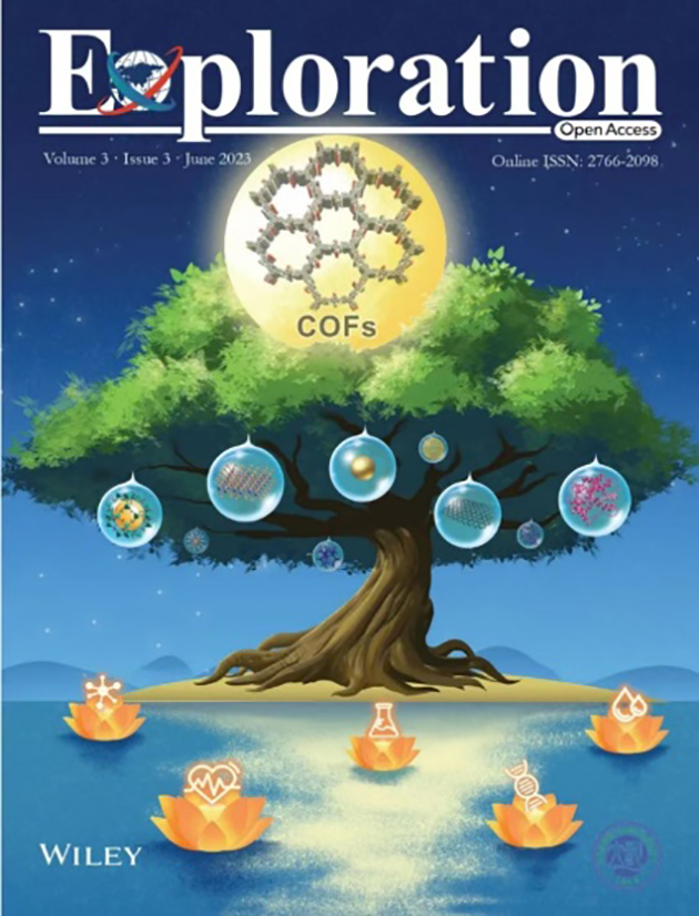 然而,COFs導(dǎo)電性弱、分散性較差、合成成本較高、難以批量生產(chǎn)等缺陷,限制了其進一步應(yīng)用。為滿足應(yīng)用需求,近年來不斷涌現(xiàn)出COFs與其他功能材料的復(fù)合材料,在一定程度上可克服單一COFs或功能材料不足的問題,表現(xiàn)出強于原來單一COFs或功能材料的性能?;?font face="Times New Roman">COFs復(fù)合材料的優(yōu)異性能,研究人員以TAPB和2,5-二乙烯基對苯二醛(DVA)為原料,在氧化石墨烯(GO)表面進行室溫席夫堿反應(yīng),原位合成了GO/COFs復(fù)合材料,成功用于環(huán)境中芳烴類化合物的吸附去除,其表現(xiàn)出比單一COFs或GO更優(yōu)異的吸附性能(Environmental Science: Nano, 2022, 9, 554)。研究人員以“Composite Materials based on Covalent Organic Frameworks for Multiple Advanced Applications”為題撰寫了相關(guān)綜述(Exploration, 2023, 3, 20220144),入選Frontispiece(圖2)。