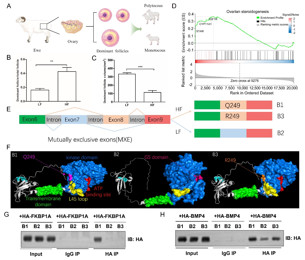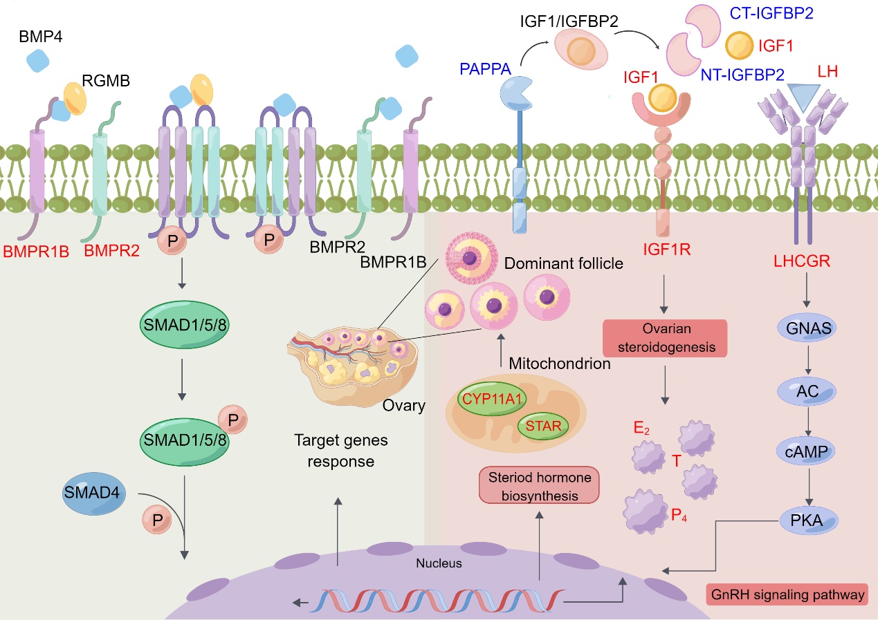 中國(guó)科學(xué)院西北高原生物研究所動(dòng)物生態(tài)與資源保護(hù)研究團(tuán)隊(duì)針對(duì)綿羊重要繁殖性狀(產(chǎn)羔數(shù)和產(chǎn)羔間隔),以連續(xù)三個(gè)產(chǎn)羔季節(jié)產(chǎn)多胎(每胎產(chǎn)兩羔或三羔,HF)和產(chǎn)單胎(每胎產(chǎn)一羔,LF)的藏羊?yàn)檠芯繉?duì)象,整合全基因組關(guān)聯(lián)分析、普通轉(zhuǎn)錄組學(xué)、單細(xì)胞轉(zhuǎn)錄組學(xué)、蛋白質(zhì)組學(xué)和代謝組學(xué)等多組學(xué)研究方法,結(jié)合KASP基因分型、實(shí)時(shí)熒光定量PCR、酶聯(lián)免疫吸附實(shí)驗(yàn)、免疫共沉淀和蛋白質(zhì)免疫印跡等分子功能驗(yàn)證實(shí)驗(yàn),挖掘藏羊產(chǎn)羔數(shù)和產(chǎn)羔間隔關(guān)鍵調(diào)控元件并揭示其高繁殖力的遺傳調(diào)控機(jī)制。全基因組關(guān)聯(lián)研究表明,BMPR1B基因與產(chǎn)羔數(shù)性狀相關(guān),PAPPA基因與產(chǎn)羔間隔性狀相關(guān)。首次構(gòu)建了藏羊卵巢單細(xì)胞圖譜,發(fā)現(xiàn)關(guān)鍵基因PAPPA特異性表達(dá)在壁層顆粒細(xì)胞亞群,且BMPR1B基因在壁層顆粒細(xì)胞和固醇生成顆粒亞群高表達(dá)?;趩渭?xì)胞轉(zhuǎn)錄組學(xué)、蛋白質(zhì)組學(xué)和代謝組學(xué)整合分析,發(fā)現(xiàn)PAPPA是刺激卵巢優(yōu)勢(shì)卵泡生長(zhǎng)發(fā)育和類固醇生成的關(guān)鍵候選基因。繁殖主效基因BMPR1B除了非同義突變,首次在藏羊中發(fā)現(xiàn)BMPR1B還存在可變剪接事件調(diào)控多胎性狀。該研究結(jié)果對(duì)分子精準(zhǔn)選育提升藏羊繁殖力和實(shí)現(xiàn)藏羊產(chǎn)業(yè)提質(zhì)增效具有重要意義。