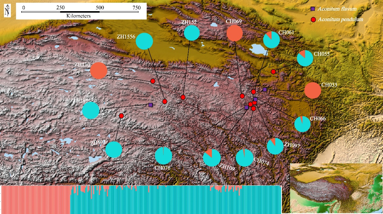 鐵棒錘(Aconitum pendulum Busch)和伏毛鐵棒錘(Aconitum flavum Hand.-Mazz.)為烏頭屬(Aconitum L.)多年生的草本植物,主要分布在青藏高原及其毗鄰地區(qū)。二者具有高度相似的形態(tài)特征,是研究青藏高原區(qū)域物種形成和演化歷史的理想材料。中國(guó)科學(xué)院西北高原生物研青藏高原植物適應(yīng)與進(jìn)化研究團(tuán)隊(duì)利用基因分型測(cè)序(Genotyping-by-sequencing,GBS)獲取全基因組單核苷酸多態(tài)性(Single Nucleotide Polymorphism,SNP),以探究二者的物種界限和遺傳多樣性。結(jié)果發(fā)現(xiàn)鐵棒錘和伏毛鐵棒錘均非單系,種間遺傳差異小于居群間遺傳差異,且具有高度重疊的生態(tài)位,因此建議將二者合并為一個(gè)物種。基因流和遺傳漂變可能是導(dǎo)致居群遺傳結(jié)構(gòu)不明顯的主要原因。末次盛冰期的氣候波動(dòng)縮小影響了居群數(shù)量,人類(lèi)活動(dòng)和生境破碎化進(jìn)一步使居群數(shù)量減少。