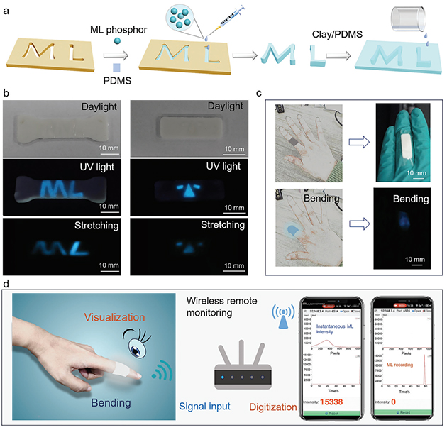 圖3. Ca6BaP4O17:Ce3+/PDMS材料在信息存儲(chǔ)和光子皮膚方面的應(yīng)用展示。