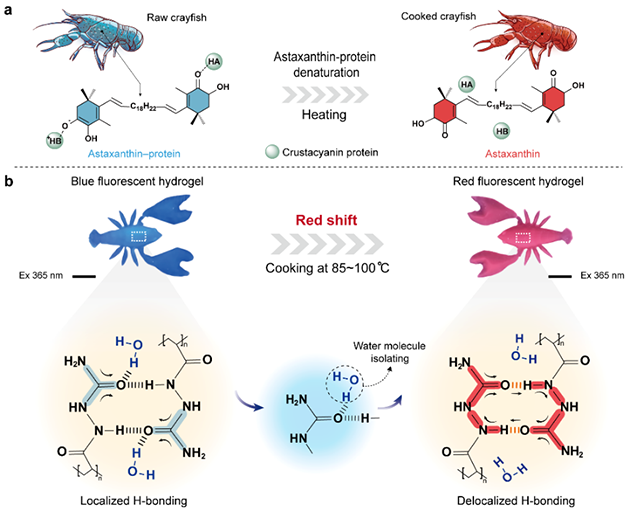 圖1. 蝦青素-蛋白質(zhì)加熱變性過程和受此啟發(fā)的熒光水凝膠制備機理