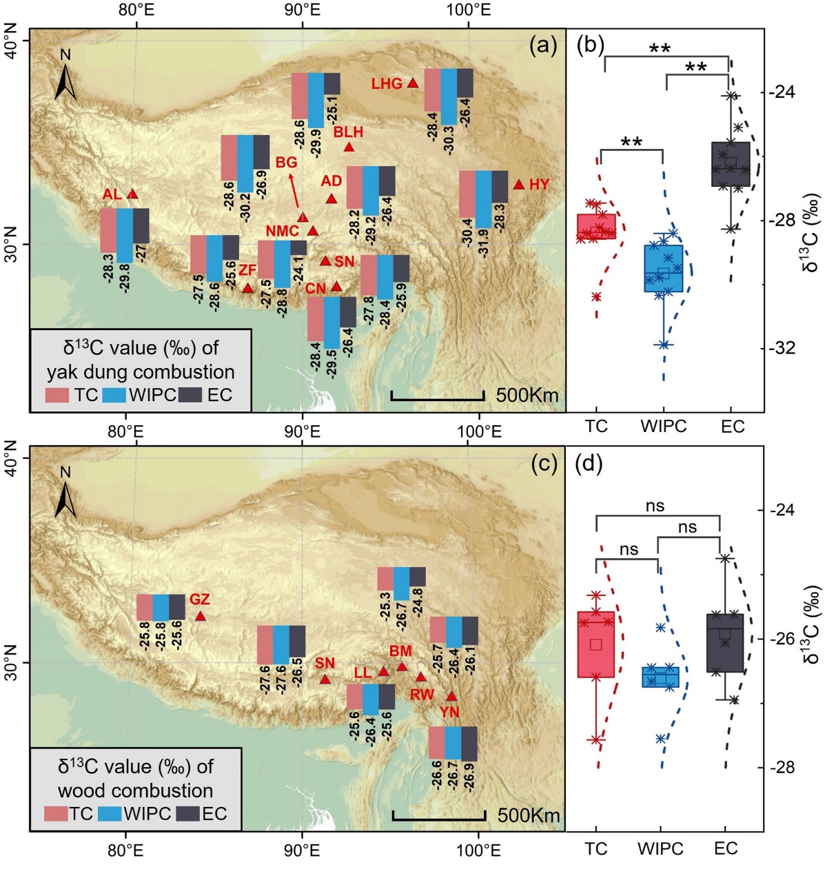 鑒于此,研究團(tuán)隊(duì)在青藏高原系統(tǒng)采集了化石燃料(交通和燃煤)排放、生物質(zhì)燃料(牛糞和木材)燃燒排放的大氣顆粒物樣品以及表土樣品。通過分析樣品中總碳(TC)、水不溶性顆粒碳(WIPC)和元素碳(EC)的δ13C特征發(fā)現(xiàn),青藏高原碳質(zhì)氣溶膠端元的δ13C值與其他地區(qū)存在顯著差異。由于海拔較高,空氣稀薄,化石燃料燃燒排放顆粒物的δ13C值相對其他地區(qū)偏負(fù)。由于燃料的特殊性,生物質(zhì)燃料燃燒排放顆粒物的δ13C值則相對其他地區(qū)偏正。且由于燃燒狀態(tài)的不同,牛糞燃燒以及交通排放顆粒物中不同碳質(zhì)組分(TC、WIPC、EC)的δ13C值存在顯著差異,而煤炭與木材燃燒排放顆粒物中不同碳質(zhì)組分的δ13C值無顯著差異。細(xì)顆粒表土(小于20μm)的δ13C值與區(qū)域植被類型的變化相關(guān)。
