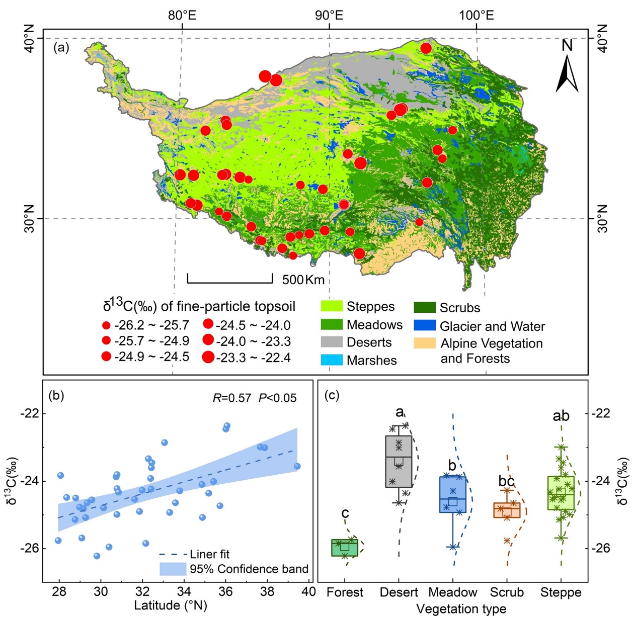 圖3. 青藏高原細(xì)顆粒表土δ13C值的空間分布