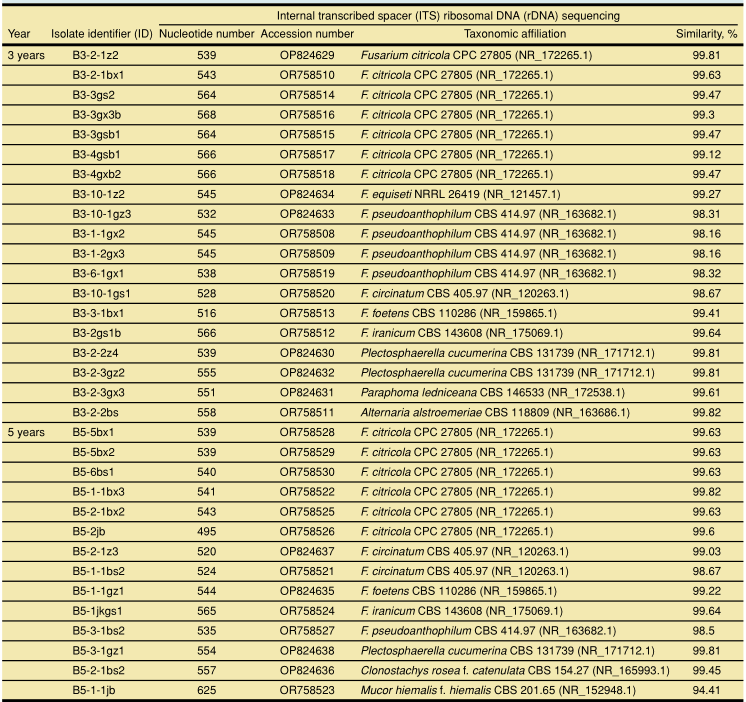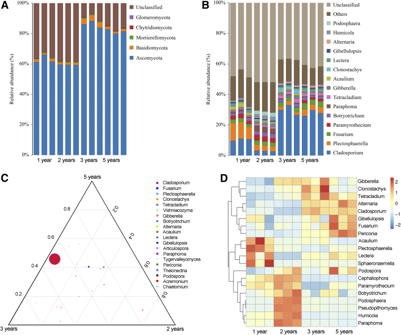 研究表明,黨參大田連作3年后,萎蔫和多種根腐病害頻發(fā);連作3年和5年土壤速效鉀含量和pH值顯著降低;與連作1年和2年相比,連作3年和5年的黨參根際土壤中真菌群落多樣性更高,并且一些屬水平的潛在致病性真菌分類群的豐度明顯增加;在連作3年和5年的黨參根際,共分離到Fusarium species complexes等菌33株;且屬水平真菌群落豐度與速效磷、全氮和土壤有機(jī)質(zhì)呈顯著正相關(guān)。