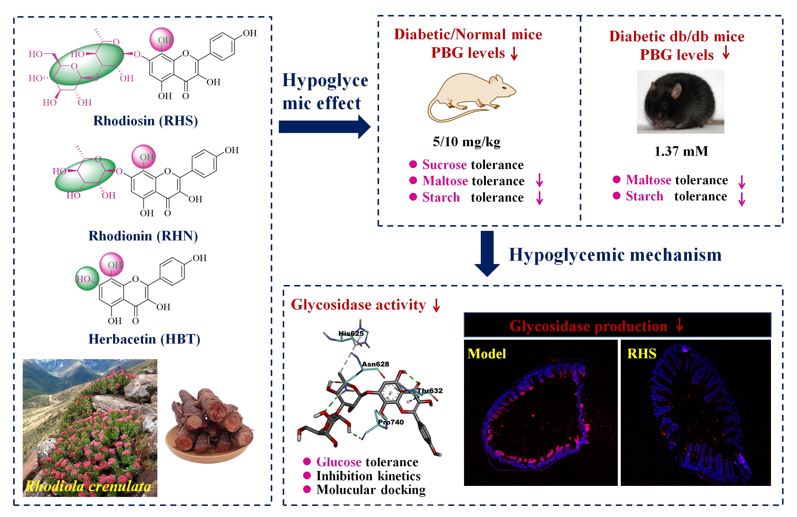 中國(guó)科學(xué)院西北高原生物研究所藏藥研究重點(diǎn)實(shí)驗(yàn)室研究發(fā)現(xiàn)8-羥基黃酮類化合物RHS(5 mg/kg和10 mg/kg)能有效降低正常和糖尿病小鼠PBG水平。同時(shí)發(fā)現(xiàn),RHS、RHN和HBT在轉(zhuǎn)基因糖尿病小鼠中均具有顯著的PBG降低作用,其作用與阿卡波糖相當(dāng)或強(qiáng)于阿卡波糖。值得注意的是,研究首次發(fā)現(xiàn)RHS不僅能夠抑制糖苷酶的活性,而且能夠顯著抑制該酶在小腸的表達(dá),從而高效的降低PBG。而糖苷酶合成或者表達(dá)的抑制可能作為降糖藥物或者糖脂代謝調(diào)節(jié)藥物研發(fā)的新靶點(diǎn)。