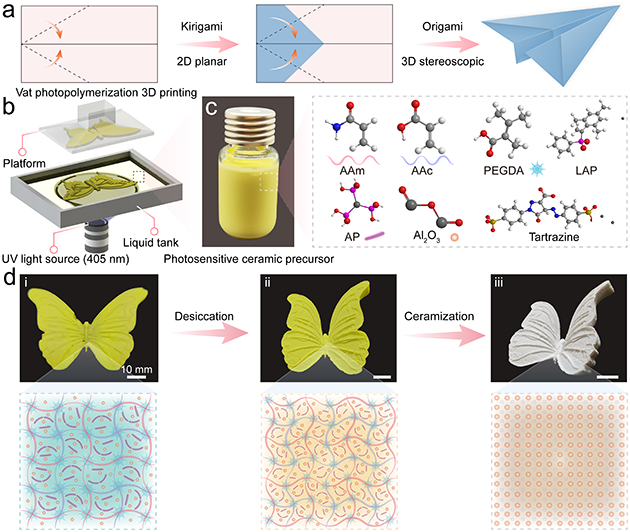 該團(tuán)隊(duì)受折紙/剪紙藝術(shù)啟發(fā),以水性無機(jī)粘結(jié)劑磷酸二氫鋁(AP)溶膠為水凝膠單體分散介質(zhì),將水凝膠單體和納米陶瓷粉體混合來制備光敏性水凝膠陶瓷漿料;利用光固化3D打印獲得具有優(yōu)異的延展性、形狀適應(yīng)性、抗疲勞性且可二次變形的水凝膠柔性骨架;依次經(jīng)過脫水干燥、低溫脫脂和高溫?zé)Y(jié)等步驟,實(shí)現(xiàn)了具有超低收縮、高陶瓷產(chǎn)率和形狀保真度的懸空大跨度陶瓷結(jié)構(gòu)(圖1)。設(shè)計(jì)的柔性水凝膠基陶瓷前驅(qū)體能夠?qū)崿F(xiàn)從平面形狀到3D立體結(jié)構(gòu)的轉(zhuǎn)變,突破了傳統(tǒng)硬質(zhì)/脆性陶瓷前驅(qū)體來制造復(fù)雜陶瓷結(jié)構(gòu)的局限。