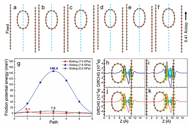 研究團(tuán)隊(duì)發(fā)現(xiàn)石墨納米片在100K以下靜態(tài)低溫條件下會發(fā)生邊緣自卷翹的奇特現(xiàn)象;利用這一效應(yīng),在摩擦過程中剪切力可進(jìn)一步驅(qū)動其在摩擦界面上原位形成納米卷軸結(jié)構(gòu),掃描電鏡圖像顯示這些納米卷軸呈現(xiàn)平行排列,且與滑動方向垂直,證明其發(fā)生了分子滾動潤滑。同時(shí)石墨表現(xiàn)出反常的宏觀真空潤滑特性,在50K真空條件下,潤滑狀態(tài)變得平穩(wěn)而長效,摩擦系數(shù)約0.06,磨損率僅為300 K時(shí)的1/50。通過密度泛函理論模擬計(jì)算,進(jìn)一步揭示了分子滾動過程界面電荷能量耗散減弱的機(jī)制。該研究為解決傳統(tǒng)石墨類材料真空潤滑性能差和超低溫潤滑領(lǐng)域難題提供了全新解決思路和方案。