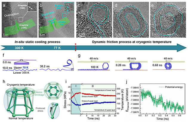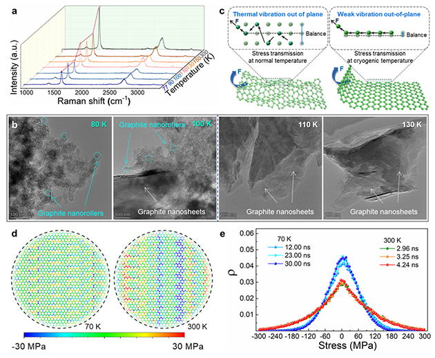 結(jié)合實(shí)驗(yàn)和理論模擬系統(tǒng),研究團(tuán)隊(duì)研究了石墨納米片邊緣自卷翹形變的影響因素、結(jié)構(gòu)演變和形成機(jī)理。結(jié)果表明,超低溫環(huán)境下,非平衡溫度場導(dǎo)致了原子的不均勻收縮,石墨片上下表面產(chǎn)生了方向相反的應(yīng)力,驅(qū)動了石墨片邊緣的自卷翹;同時(shí)發(fā)現(xiàn)熱振動對原子間應(yīng)力傳遞的耗散作用,當(dāng)溫度低于100K時(shí),原子熱振動顯著減弱,原子間應(yīng)力傳遞耗散被抑制,促進(jìn)了石墨納米片自卷翹形變的發(fā)生。該研究將為認(rèn)識微觀粒子受力傳遞規(guī)律和納米形變機(jī)理提供新的理解,同時(shí)發(fā)現(xiàn)了一種利用溫度操控自卷曲納米形變行為的新方法,在潤滑、傳感等眾多領(lǐng)域具有廣泛應(yīng)用價(jià)值。