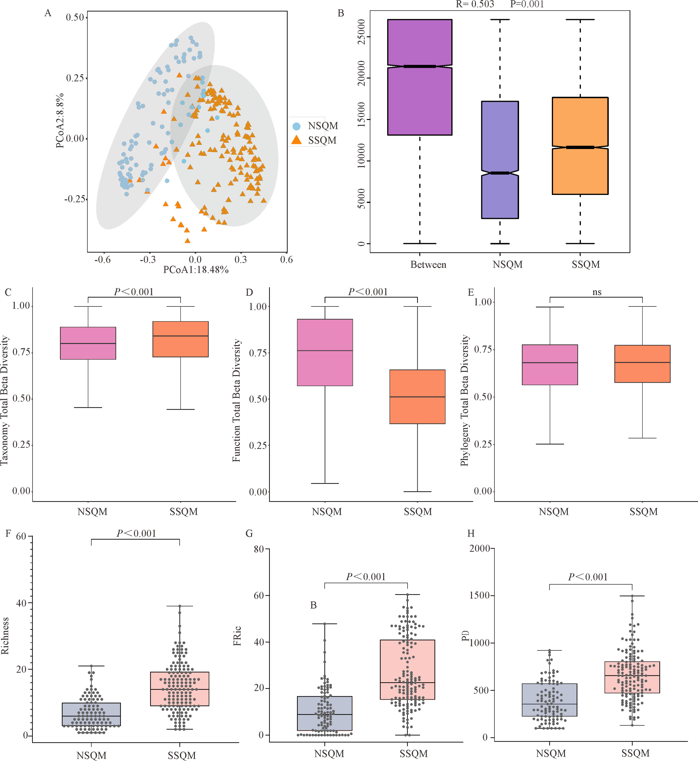 祁連山南北坡鳥類群落多樣性格局。(A) NSQM和SSQM中鳥類β多樣性的主坐標分析(PCoA);(B) NSQM和SSQM中鳥類群落的相似性(ANOSIM);(C, D, E) NSQM和SSQM中鳥類群落分類, 功能, 系統(tǒng)發(fā)育總β多樣性;(F, G, H) NSQM和SSQM中鳥類群落Richness指數(shù), FRic和PD指數(shù)