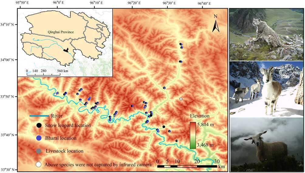 中國(guó)科學(xué)院西北高原生物研究所動(dòng)物生態(tài)與資源保護(hù)研究團(tuán)隊(duì)以人獸沖突較為嚴(yán)重的曲麻萊縣巴干鄉(xiāng)為研究地區(qū),利用調(diào)查問卷評(píng)估了當(dāng)?shù)啬撩駥?duì)雪豹襲擊家畜事件的態(tài)度,并結(jié)合紅外相機(jī)陷阱技術(shù)獲得了雪豹和其主要獵物巖羊(Pseudois nayaur)以及散養(yǎng)家畜的影像資料,進(jìn)而探討了三種(類)動(dòng)物的時(shí)空重疊。研究結(jié)果表明: (1)雪豹主要在夜間捕食家畜,牧民因雪豹襲擊家畜事件的發(fā)生而對(duì)雪豹保護(hù)持消極態(tài)度;(2)巖羊和家畜的空間利用重疊度最高(OI?。健?.78),其次是雪豹和巖羊(OI?。健?.75)以及雪豹和家畜(OI?。健?.75);(3)雪豹屬于典型的夜行性動(dòng)物,而巖羊和家畜以晝間活動(dòng)為主。巖羊和家畜的日活動(dòng)節(jié)律模式高度一致,時(shí)間重疊指數(shù)最高(D?。健?.95),而雪豹和巖羊、雪豹和家畜的日活動(dòng)節(jié)律重疊指數(shù)較低(D?。健?.51),且重疊時(shí)段主要集中于夜間。綜上所述,由于雪豹、巖羊和散養(yǎng)家畜之間存在較高的空間重疊,可能增加了家畜被雪豹捕食的機(jī)會(huì),同時(shí),家畜和巖羊活動(dòng)節(jié)律的高度重疊進(jìn)一步加劇了此類事件的發(fā)生幾率?;谘芯拷Y(jié)果,我們提出了針對(duì)性的保護(hù)和管理措施,例如規(guī)范放牧區(qū)域以減小家畜與雪豹的相遇幾率,加強(qiáng)對(duì)散養(yǎng)家畜的夜間管理以減少雪豹夜間肇事等。