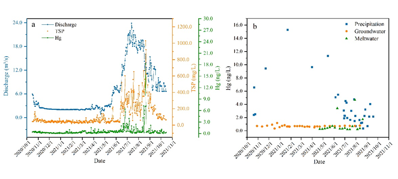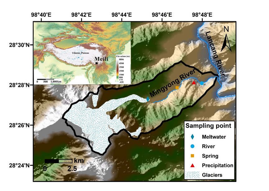 中國(guó)科學(xué)院西北生態(tài)環(huán)境資源研究院冰凍圈科學(xué)與凍土工程重點(diǎn)實(shí)驗(yàn)室科研團(tuán)隊(duì),聯(lián)合中國(guó)科學(xué)院地質(zhì)與地球物理研究所、浙江師范大學(xué)、云南大學(xué)等多家單位,依托云南麗江玉龍雪山冰凍圈與可持續(xù)發(fā)展國(guó)家野外科學(xué)觀測(cè)研究站“一站四區(qū)”觀測(cè)網(wǎng),在梅里雪山明永河流域開展了為期一年的日尺度觀測(cè),剖析冰川徑流中總汞濃度的變化規(guī)律及控制因素,量化汞的輸入通量,并評(píng)估明永河流域以及整個(gè)青藏高原冰川徑流中總汞的輸出通量。