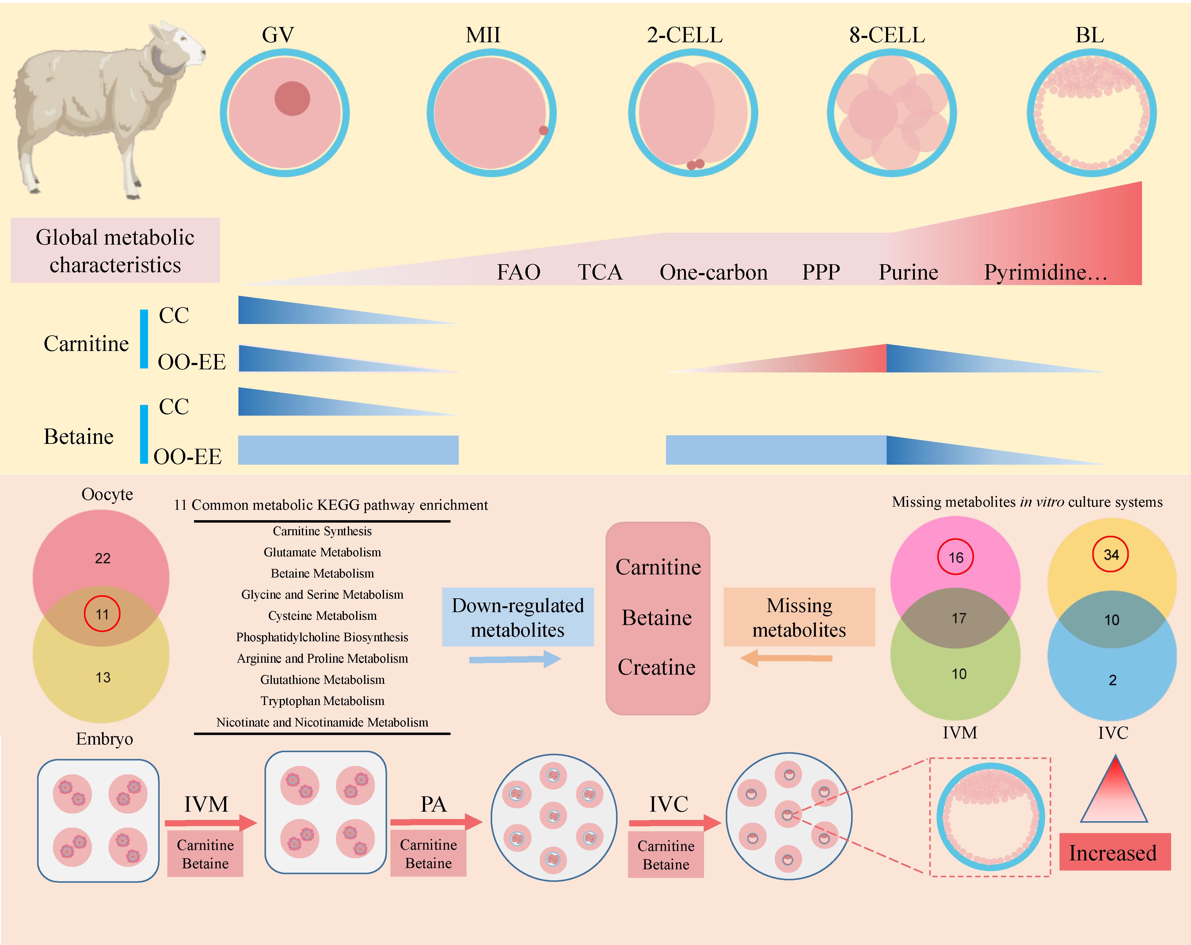 中國科學(xué)院西北高原生物研究所動(dòng)物生態(tài)與資源保護(hù)研究團(tuán)隊(duì)與四川農(nóng)業(yè)大學(xué)動(dòng)物科技學(xué)院團(tuán)隊(duì)合作,通過利用超靈敏微量代謝組學(xué)技術(shù)和單細(xì)胞轉(zhuǎn)錄組學(xué)技術(shù),對(duì)綿羊卵母細(xì)胞體外成熟及早期胚胎體外發(fā)育的代謝特征進(jìn)行了解析,發(fā)現(xiàn):從GV期卵母細(xì)胞至2-細(xì)胞胚胎階段整體代謝水平呈上升趨勢(shì),為促進(jìn)卵母細(xì)胞成熟和合子發(fā)育提供了必要的代謝底物;而在2-細(xì)胞胚胎至8細(xì)胞胚胎階段,整體代謝表現(xiàn)出安靜狀態(tài),有助于減少氧化應(yīng)激對(duì)細(xì)胞的損傷;在8-細(xì)胞胚胎至囊胚階段,整體代謝水平又明顯增加,為早期囊胚的形成、增殖分化以及表觀修飾過程提供能量和所需的代謝底物。同時(shí),鑒定出肉毒堿、甜菜堿和肌酸為該體外培養(yǎng)系統(tǒng)所缺失的關(guān)鍵代謝物。進(jìn)一步研究發(fā)現(xiàn),肉毒堿可促進(jìn)綿羊卵母細(xì)胞脂肪酸氧化,并降低脂質(zhì)含量和脂質(zhì)過氧化水平,同時(shí)還可以調(diào)節(jié)紡錘體形態(tài)。而甜菜堿則具有調(diào)節(jié)綿羊早期胚胎發(fā)育過程中滲透壓應(yīng)激和甲基化修飾的作用。當(dāng)聯(lián)合肉毒堿與甜菜堿添加至體外培養(yǎng)體系時(shí),顯著提高了綿羊卵母細(xì)胞的囊胚發(fā)育率。該研究結(jié)果為提高卵母細(xì)胞成熟和胚胎培養(yǎng)提供了新的視角。