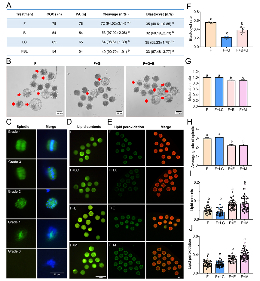 論文代表圖:A:關(guān)鍵代謝物肉毒堿與甜菜堿促進(jìn)綿羊卵母細(xì)胞的孤雌發(fā)育潛力;B和F: 甜菜堿可挽救滲透應(yīng)激的下綿羊胚胎的發(fā)育潛力;C、G和H: 肉毒堿可促進(jìn)卵母細(xì)胞成熟和調(diào)控紡錘體形態(tài);D、E、I和J:肉毒堿可降低卵母細(xì)胞內(nèi)脂質(zhì)含量和脂質(zhì)過氧化水平。