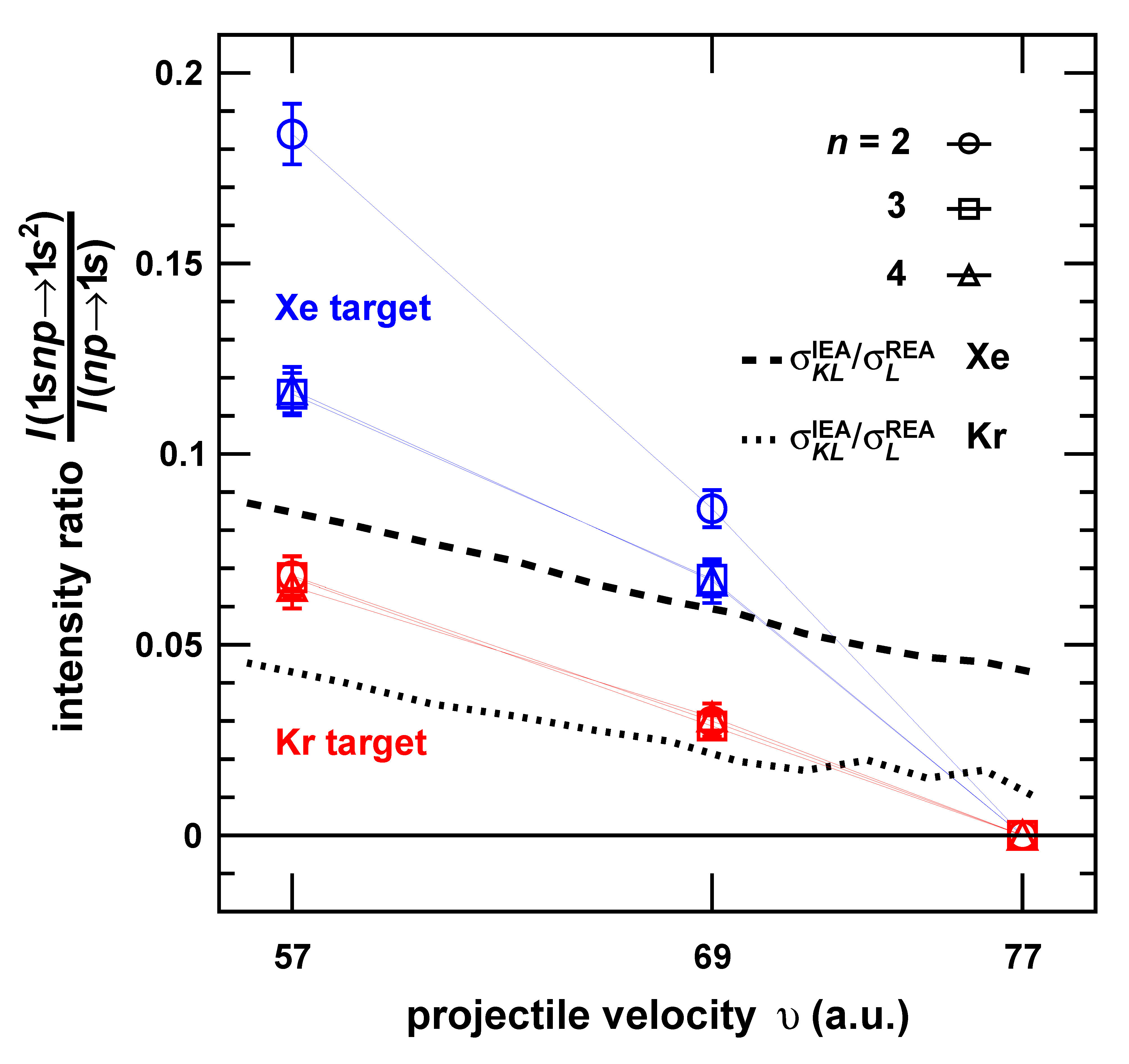 近代物理所原子分子譜學(xué)研究團隊利用蘭州重離子加速器冷卻儲存環(huán)(HIRFL-CSR),開展了百MeV/u能區(qū)Xe54++Xe對稱碰撞實驗研究。在“能級匹配”和“速度匹配”條件同時滿足時,團隊發(fā)現(xiàn)共振電子俘獲在非輻射雙電子俘獲(NRDC)過程中起重要作用,引起關(guān)聯(lián)俘獲,此時獨立電子近似不再成立。與之相反,Xe54++Kr碰撞中的NRDC過程是兩個獨立的單俘獲。