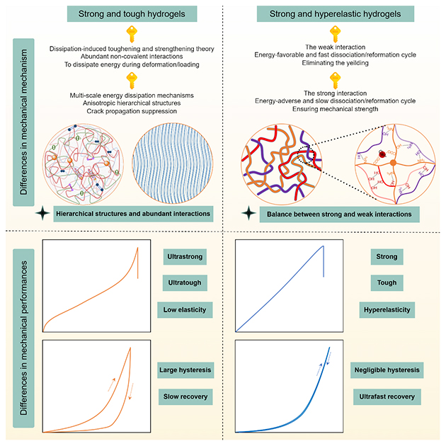 圖1. 強(qiáng)韌水凝膠和超彈性水凝膠在力學(xué)機(jī)制和性能方面的差異
