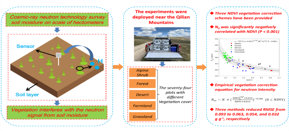 中國科學(xué)院西北生態(tài)環(huán)境資源研究院趙文智和張勇勇研究團隊通過野外考察、定位觀測和模型分析等手段,從樣地—樣線—區(qū)域多尺度,對祁連山、河西走廊近地表宇宙射線中子強度特征、非土壤水氫源類型和中尺度土壤水分時空格局等進行了研究。