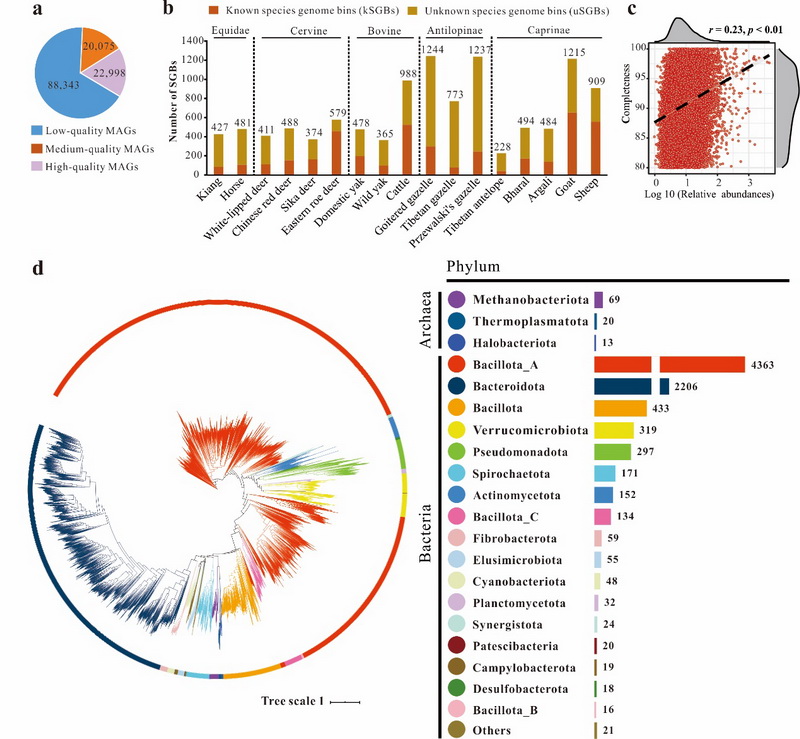 中國(guó)科學(xué)院西北高原生物研究所動(dòng)物生態(tài)與資源保護(hù)研究團(tuán)隊(duì)以中國(guó)境內(nèi)奇蹄目(Perissodactyla)和鯨偶蹄目(Cetartiodactyla)17個(gè)常見(jiàn)有蹄類物種為研究對(duì)象,通過(guò)大規(guī)模宏基因組測(cè)序和組裝、分箱和注釋,獲得131,416個(gè)宏基因組組裝基因組(MAGs),其中包含22,998個(gè)高質(zhì)量MAGs和11,175個(gè)菌種水平基因組(SGBs),成功構(gòu)建了中國(guó)典型有蹄類物種的腸道微生物宏基因組圖譜,其中60%左右的SGBs為本研究首次報(bào)道。
