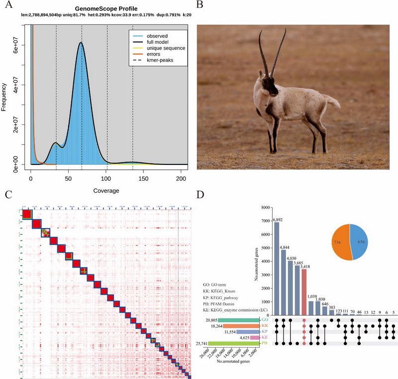 中國(guó)科學(xué)院西北高原生物研究所動(dòng)物生態(tài)與資源保護(hù)研究團(tuán)隊(duì)聯(lián)合青海大學(xué),基于PacBio HiFi三代基因組測(cè)序、Hi-C測(cè)序和DNBSEQ-T7二代基因組survey測(cè)序三種測(cè)序技術(shù),成功組裝了藏羚染色體級(jí)別的基因組。結(jié)果顯示,藏羚基因組大小為3.1 Gb,Contig N50為84.6 Mb,所有基因掛載到30條染色體上(29?。),與之前的核型研究一致。數(shù)據(jù)評(píng)估顯示,藏羚基因組BUSCO得分為98.2%(S:92.3%,D:5.9%,F(xiàn):0.8%,M:1.0%),平均QV值為70.14,表明組裝的連續(xù)性好,完整度和準(zhǔn)確性高?;贓DTA和RepeatModeler從頭預(yù)測(cè)的藏羚基因組中重復(fù)序列注釋結(jié)果表明,藏羚基因組重復(fù)序列主要由SINEs、LINEs、LTRs 和DNA transposons四種類(lèi)型組成,序列總長(zhǎng)度為1.65 Gb,占基因組的52.47%;基于蛋白同源預(yù)測(cè)、蛋白從頭預(yù)測(cè)和深度學(xué)習(xí)等多種策略,在藏羚基因組上共注釋到28,330個(gè)功能基因。綜上,通過(guò)多種技術(shù)手段,首次獲得了藏羚染色體水平的高質(zhì)量基因組和注釋信息,為藏羚的適應(yīng)進(jìn)化遺傳機(jī)制、保護(hù)遺傳學(xué)研究及進(jìn)一步探索物種遷徙行為的遺傳機(jī)制提供了重要的基因組資源。