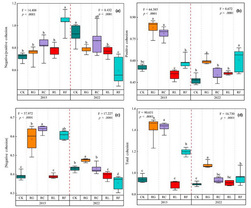 不同時間段下植物功能群去除后群落中負內(nèi)聚力與正內(nèi)聚力情況