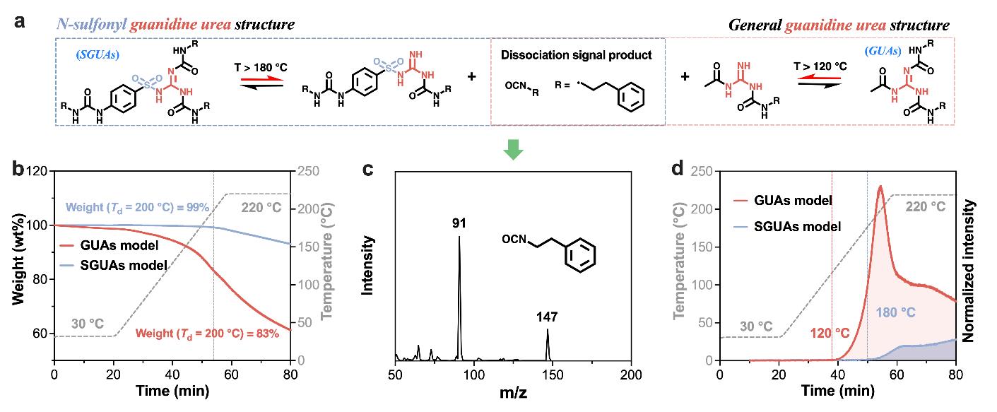 由于胍胺脲鍵具有高度的解離性,聚胍脲材料的熱穩(wěn)定性和尺寸穩(wěn)定性表現較差。針對這一問題,近期報道了一種N-磺?;译褰Y構(SGUA)。相比于GUA結構,SGUA結構在保持動態(tài)特性的同時,其解離溫度得到了很大提升,從120 °C提升至180 °C(圖2)。相應聚合物材料的熱穩(wěn)定性和尺寸穩(wěn)定性也得到了大幅提升。盡管SGUA結構的解離溫度超過了180 °C,但這種材料在160 °C,20 MPa條件下仍能夠進行熱壓成型。網絡的流變行為表明,這種網絡不再遵循解離型交換反應機制,而是符合結合型網絡交換的特點。相關成果以“N-Sulfonyl Guanidine Urea to Design Ultrastrong,Stable,and Recyclable Associative Dynamic Polyurea Networks”為題,發(fā)表在Macromolecules(2024,57,23,10938–10947)。