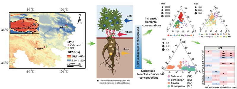 唐古特大黃(Rheum tanguticum)為青藏高原特有的藥用植物,具有瀉下攻積、涼血解毒、逐瘀通經(jīng)、利濕退黃等功效,其關(guān)鍵生物活性化合物為蒽醌類、二蒽酮類以及鞣質(zhì)類化合物。近年來,隨著市場需求的增加,野生資源逐漸減少,栽培唐古特大黃成為重要替代品。然而,栽培品種的品質(zhì)與野生種存在顯著差異,制約了產(chǎn)業(yè)發(fā)展。植物微生物組和礦質(zhì)元素已被證實(shí)在藥用植物品質(zhì)形成中具有重要的作用。但是,野生和栽培唐古特大黃微生物組和礦質(zhì)元素對關(guān)鍵生物活性化合物的影響在很大程度上仍未得到研究。