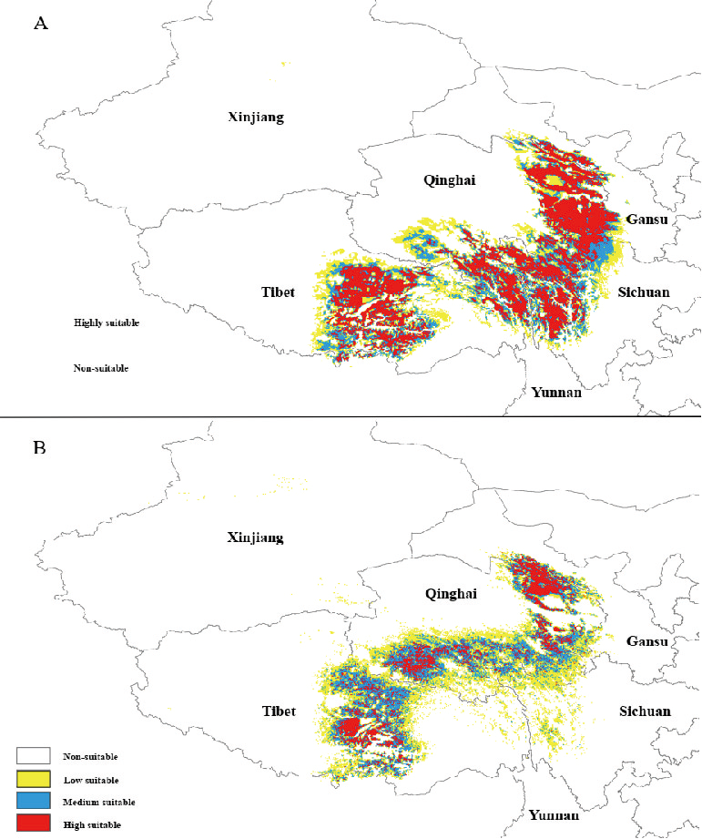 當前(A)和未來全球變暖(B)情景下肉果草的潛在分布情況