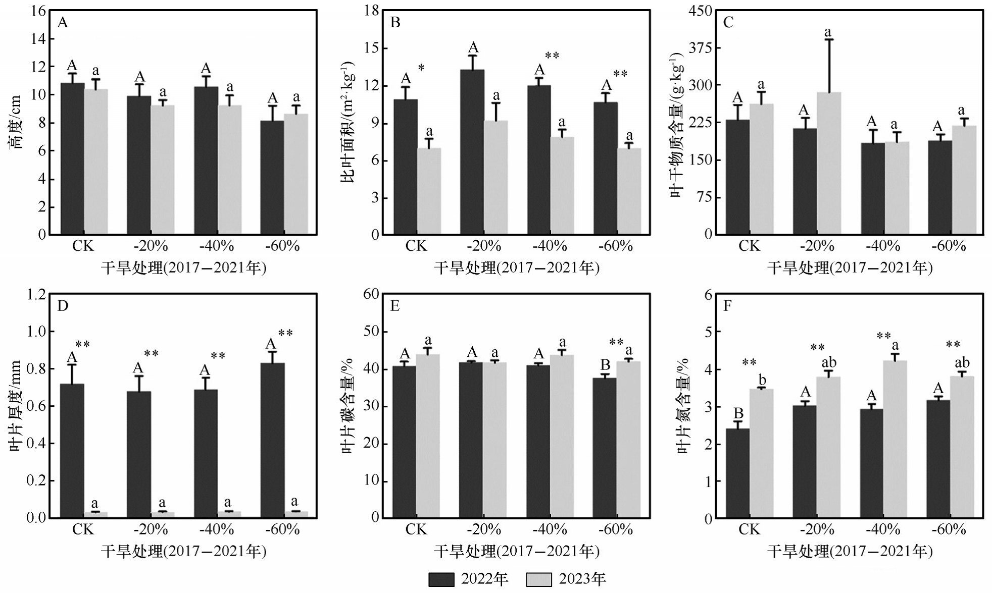 結(jié)果表明,干旱解除2年后,除減雨40%處理的物種豐富度顯著低于對照外,其他處理的物種豐富度以及所有處理下的密度、植物功能性狀、ANPP 均與對照無顯著差異,表明荒漠草原具有較強(qiáng)的恢復(fù)能力。在恢復(fù)期間,生長季降水對植被恢復(fù)影響顯著,恢復(fù)第1年(2022年)生長季降水量較高,減雨40%處理的葉片氮含量顯著高于對照,而所有處理的物種豐富度、密度、株高、比葉面積(SLA)、葉干物質(zhì)含量、葉片厚度(LT)和ANPP均與對照無顯著差異?;謴?fù)第2年(2023年)的生長季干旱使物種豐富度、密度、SLA、LT 和ANPP顯著低于第1年,葉片碳氮含量則相反。