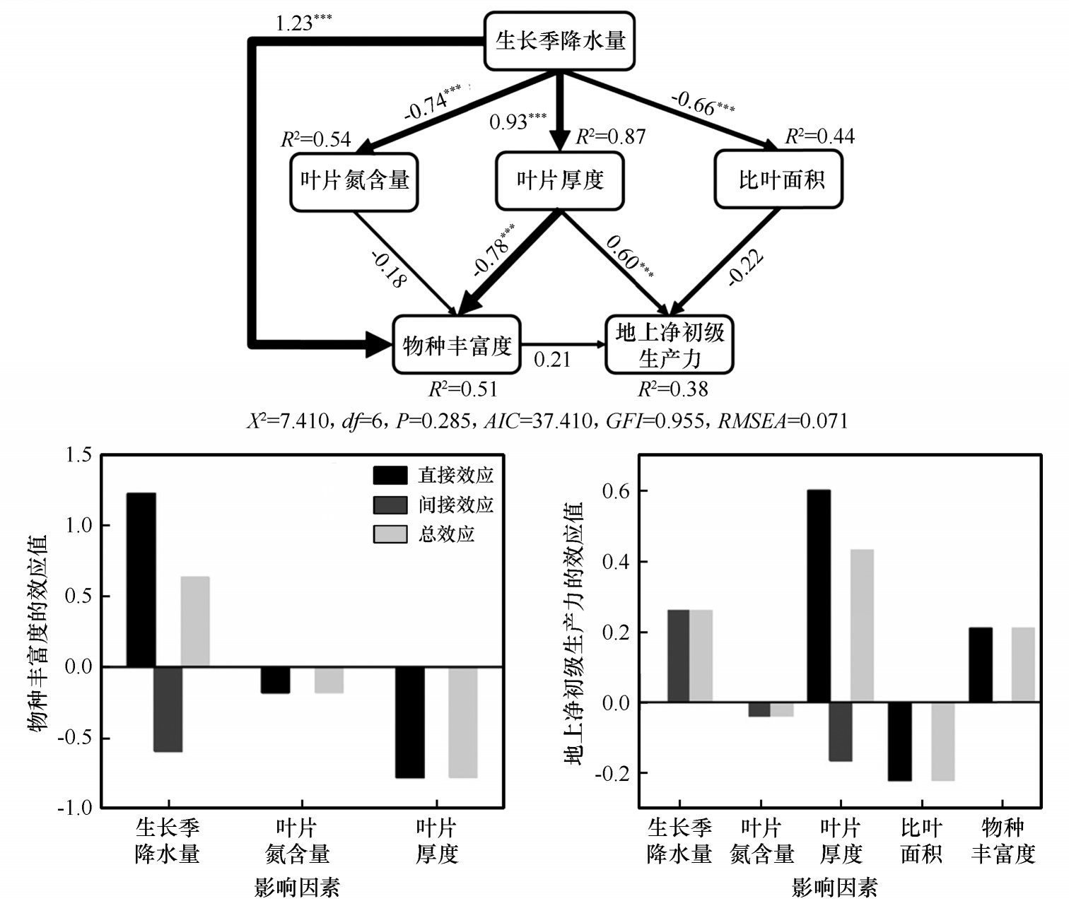 生長季降水對退化植被恢復(fù)過程中植物多樣性和生產(chǎn)力影響的結(jié)構(gòu)方程模型效應(yīng)值