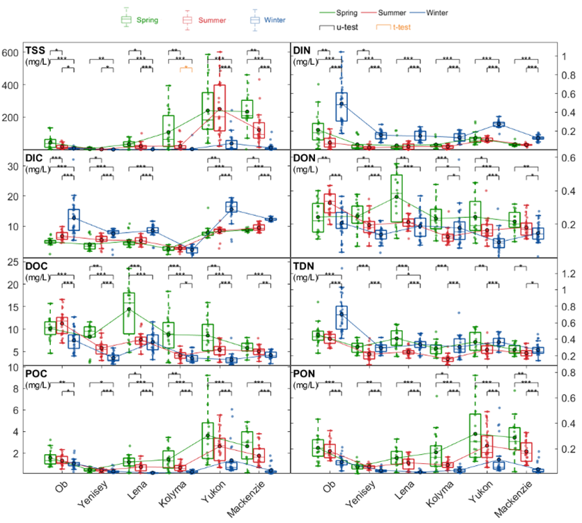 2009–2021年間碳、氮濃度的季節(jié)變化。河流按西至東(由左至右)排列,依次為鄂畢河、葉尼塞河、勒拿河、科雷馬河、育空河和麥肯齊河