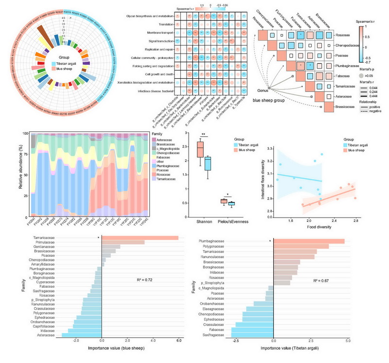 中國科學(xué)院西北高原生物研究所動物生態(tài)與資源保護研究團隊在青海省昆侖山地區(qū)采集了西藏盤羊與巖羊的新鮮糞便樣本,結(jié)合宏基因組測序與植物 trnL片段的高通量測序技術(shù),深入分析了兩者腸道菌群組成、功能特征及食性結(jié)構(gòu)與腸道菌群在生態(tài)適應(yīng)與營養(yǎng)生態(tài)位分化中的潛在作用。研究發(fā)現(xiàn),西藏盤羊與巖羊共棲于高寒生態(tài)環(huán)境中,但其腸道菌群在組成結(jié)構(gòu)與功能特征方面表現(xiàn)出了顯著差異。食性多樣性的高低并不必然反映腸道菌群多樣性的水平,其中西藏盤羊雖食性相對單一,但其腸道菌群多樣性更高,具有更強的代謝適應(yīng)性與纖維降解能力;而巖羊擁有更廣泛的植物攝食譜,卻表現(xiàn)出在糖類代謝相關(guān)功能上更強的腸道菌群代謝適應(yīng)能力。綜合來看,腸道菌群與食性之間的協(xié)同作用可能在推動兩物種營養(yǎng)生態(tài)位分化中發(fā)揮重要作用。此外,兩種動物在抗生素耐藥基因組成上也存在差異,提示該類指標(biāo)在未來野生動物健康評估中具有潛在應(yīng)用價值。本研究揭示了腸道菌群作為宿主環(huán)境適應(yīng)和生態(tài)位分化的重要調(diào)控因子,其與食性協(xié)同作用推動了高原野生動物的生態(tài)位分化。研究成果為理解大型食草動物腸道菌群與環(huán)境適應(yīng)及生態(tài)位分化提供了全新視角,也為瀕危物種保護和高原生態(tài)系統(tǒng)可持續(xù)發(fā)展提供了重要參考。