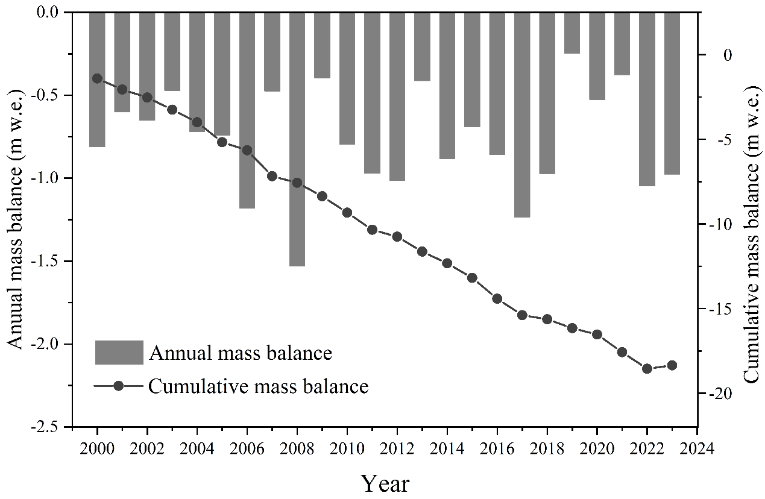 研究團(tuán)隊選用全分量分布式能量平衡模型(COSIPY),以2015年來逐年物質(zhì)平衡實地觀測數(shù)據(jù)和2000年來每5年間隔大地測量法獲取的物質(zhì)平衡變化作為驗證,模擬重建了2000年至2023年物質(zhì)平衡逐年序列,通過誤差評估和不確定性分析,明確了研究結(jié)果的可靠性。