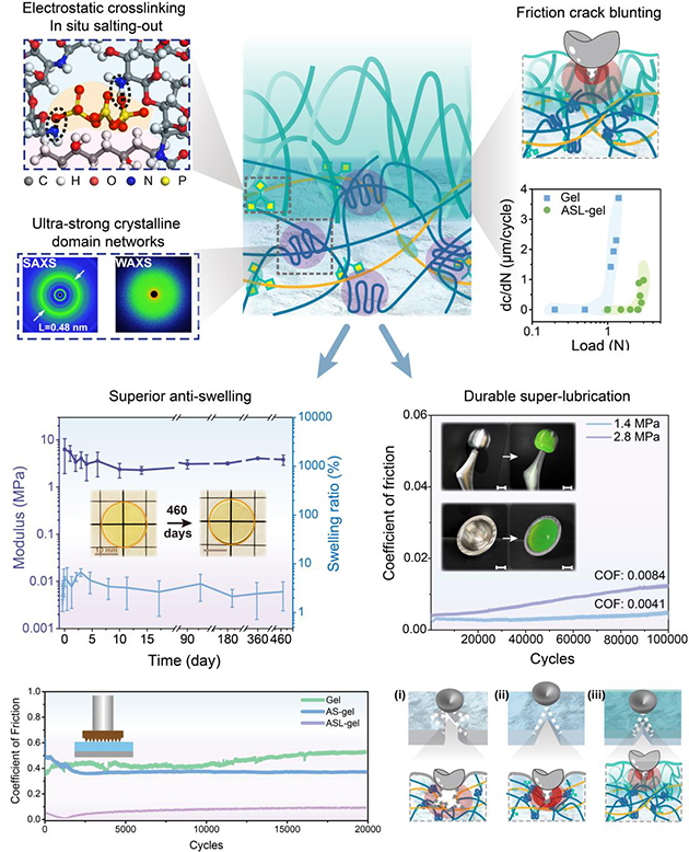 在解決聚合物凝膠材料超高承載和機械魯棒性超潤滑難點基礎(chǔ)之上,研究人員將關(guān)注點轉(zhuǎn)移到解決材料在苛刻鹽離子介質(zhì)中的長效力學穩(wěn)定性難題。盡管已報道的大多數(shù)聚合物凝膠材料能夠?qū)崿F(xiàn)優(yōu)異的承載與減摩功能,但其在復(fù)雜離子介質(zhì)中普遍存在溶脹和力學失效問題,摩擦學評價往往以去離子水為潤滑介質(zhì),這明顯與聚合物材料的實際應(yīng)用工況不符(海水或生理介質(zhì)),使得相關(guān)材料的開發(fā)僅僅停留在概念和模型水平。