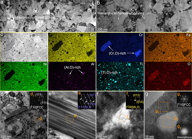 圖1. Co25Ni23Cr20Fe20Ti6Al4B2高熵納米復(fù)合材料的高密度分級異質(zhì)性結(jié)構(gòu)