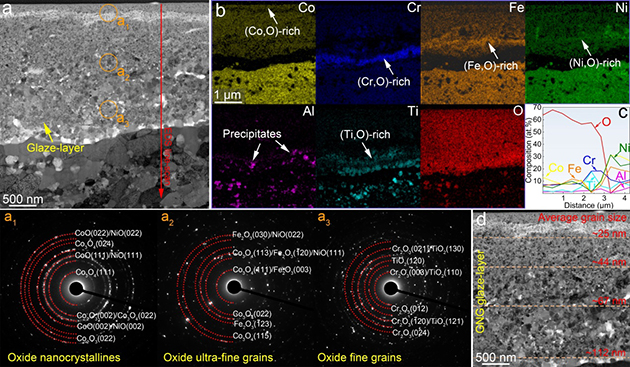 近日,中國科學(xué)院蘭州化學(xué)物理研究所潤滑材料全國重點(diǎn)實驗室高溫摩擦學(xué)課題組與香港城市大學(xué)機(jī)械工程系先進(jìn)結(jié)構(gòu)材料課題組,在長期合作基礎(chǔ)上提出了一種基于晶體-非晶異質(zhì)結(jié)構(gòu)與梯度納米氧化層協(xié)同調(diào)控的高熵納米復(fù)合材料設(shè)計策略。團(tuán)隊設(shè)計制備了一種Co25Ni23Cr20Fe20Ti6Al4B2高熵納米復(fù)合材料,包含高密度Ti–O富集非晶納米析出相的多級異質(zhì)結(jié)構(gòu)。在1000 ℃和較高接觸應(yīng)力條件下,該材料表面原位生成微米級厚度的梯度納米釉質(zhì)層,其晶粒尺寸沿深度方向從表面25nm漸增至基體112nm,實現(xiàn)了應(yīng)變逐層協(xié)調(diào)與應(yīng)力有效緩解。得益于這一結(jié)構(gòu)演化,該材料在1000 °C實驗中獲得了-2.3×10-6mm3/Nm的穩(wěn)定負(fù)磨損率與0.26的低摩擦系數(shù),刷新了金屬基抗磨材料的高溫性能紀(jì)錄。