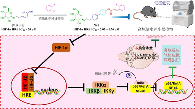 研究團(tuán)隊聚焦高原腦水腫防治重大問題,以高原特色中草藥紅景天中的活性成分紅景天苷為結(jié)構(gòu)基礎(chǔ),基于骨架躍遷和分子雜合的藥物設(shè)計策略,通過引入鄰氟苯基HIF-1α抑制劑藥效團(tuán),對紅景天苷的糖苷鍵、連接鏈、芳環(huán)取代基等三個部分進(jìn)行結(jié)構(gòu)修飾,設(shè)計并合成了多種紅景天苷衍生物開展構(gòu)效關(guān)系研究。通過雙熒光素酶報告基因、細(xì)胞毒、ELISA等實驗,篩選獲得強活性化合物N41,可顯著抑制HIF-1α HRE轉(zhuǎn)錄(IC50: 2.02 ± 0.76 μM),減少C8-D1A細(xì)胞炎癥因子IL-6和NO的表達(dá)以及ROS積累,減輕氧化損傷且無明顯細(xì)胞毒性。HACE小鼠模型研究發(fā)現(xiàn),N41可有效降低HACE模型小鼠腦含水量,改善缺氧導(dǎo)致的腦組織損傷,通過阻斷HIF-1α/IKKα/NF-κB信號通路,抑制下游TNF-α、IL-6等炎癥因子及MMP-9、AQP-4等血腦屏障通透性相關(guān)因子表達(dá),緩解炎癥反應(yīng)和維持血腦屏障完整性,發(fā)揮高原腦水腫防治功效。相關(guān)研究成果發(fā)表在European Journal of Medicinal Chemistry(2025,297: 117982)上。
