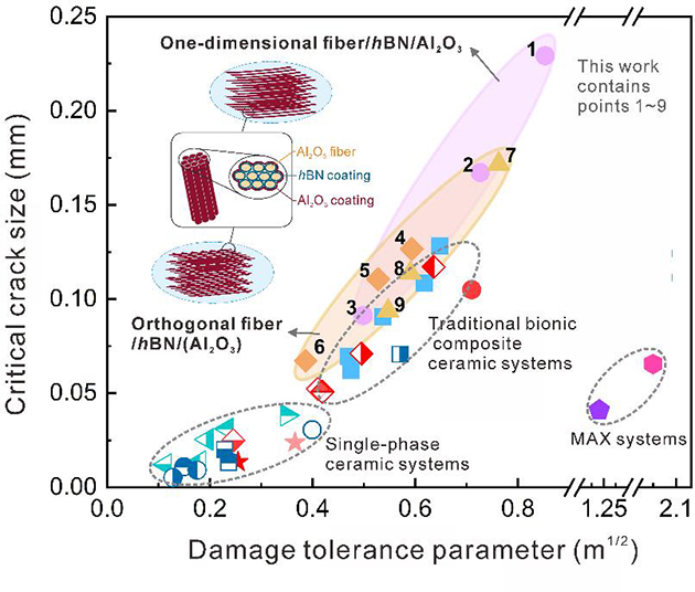 該仿生復(fù)合陶瓷能夠承受多次循環(huán)加載而保持漸進性失效特征,后續(xù)循環(huán)的最大承載能力可保持在前一個循環(huán)的85%以上,突破了傳統(tǒng)陶瓷本征脆性和災(zāi)難性斷裂的性能桎梏。這些優(yōu)勢得益于多級精細結(jié)構(gòu)在裂紋引發(fā)后提供了更為豐富且多尺度層面的裂紋擴展行為,賦予了材料極大的潛力——允許纖維之間存在大尺寸裂紋,且最大程度上保留承載能力。這種集強韌耐損傷為一體的仿生復(fù)合陶瓷在航空航天、先進制造、能源裝備等高技術(shù)領(lǐng)域具有巨大潛力。