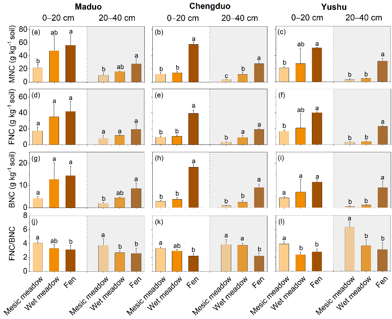 中國科學(xué)院西北生態(tài)環(huán)境資源研究院李玉強研究員團(tuán)隊,在青藏高原沿高寒草甸-濕地連續(xù)體設(shè)置了27個采樣點,通過測定氨基糖等指標(biāo),系統(tǒng)揭示了水文變化對土壤微生物殘體碳和顆粒有機(jī)碳積累及其對土壤有機(jī)碳貢獻(xiàn)的影響。