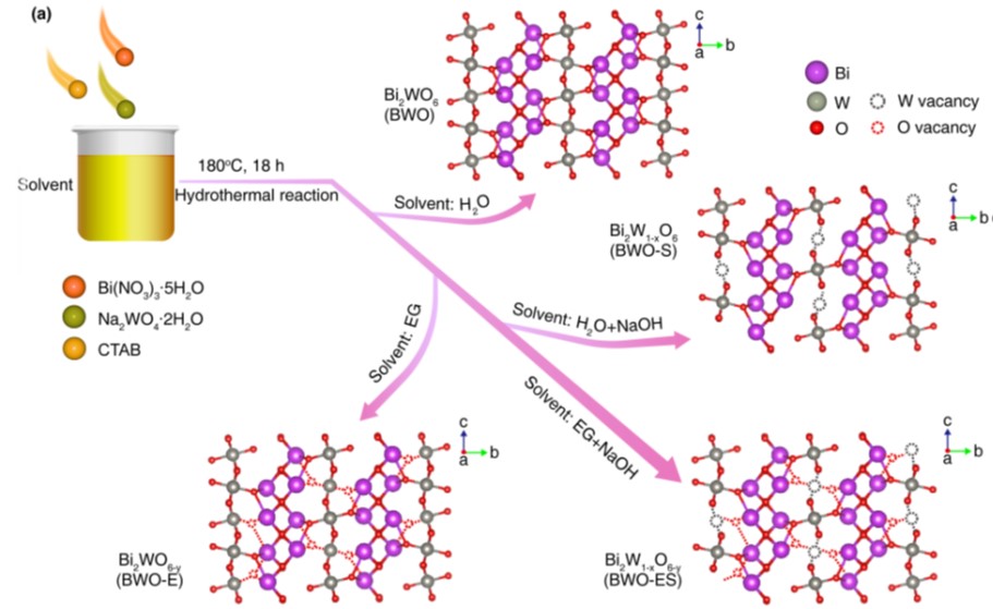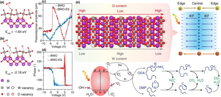 中國科學(xué)院青海鹽湖研究所輕合金與稀散元素分離課題組根據(jù)鉀鹽浮選藥劑性質(zhì)特點(diǎn),聚焦綠色高效處理的研究需要,結(jié)合高原地區(qū)自然光輻照強(qiáng)度大等優(yōu)勢,優(yōu)化光催化材料缺陷工程改性策略,成功制備金屬/非金屬雙缺陷鉍酸鹽光催化材料,考察其對可見光的吸收利用,并對雙缺陷結(jié)構(gòu)改性鉍酸鹽光催化劑的催化作用機(jī)制開展深入剖析。研究發(fā)現(xiàn),在水熱制備Bi2WO6過程中加入適當(dāng)比例的還原劑(EG)和刻蝕劑(NaOH),可以實(shí)現(xiàn)“一鍋法”在Bi2WO6納米片的中心和邊緣區(qū)域分別構(gòu)筑O缺陷和W缺陷,強(qiáng)化提升鉍酸鹽的催化性能。機(jī)理研究發(fā)現(xiàn):在雙缺陷結(jié)構(gòu)材料(BWO-ES)中,W缺陷作為負(fù)電荷中心,O缺陷充當(dāng)局部的正電荷中心。當(dāng)這些帶相反電荷的缺陷在晶格不同位置建立時(shí),使Bi2WO6材料的靜電偶極距由本體材料(BWO)的1.54 D提升至BWO-ES的48.15 D,促使材料的內(nèi)建電場強(qiáng)度提升2.74倍,為光生電子-空穴對的有效分離提供了內(nèi)部驅(qū)動(dòng)力,從而抑制光生載流子的復(fù)合,表現(xiàn)的瞬態(tài)熒光壽命由BWO的1.61 ns提升至BWO-ES的2.63 ns。此外,O缺陷的構(gòu)筑降低了材料的帶隙(2.78 ev→2.54 eV),拓展了材料的光響應(yīng)范圍(446 nm→488 nm)。在可見光(λ≥400 nm)照射下,BWO-ES對十八胺(ODA)和十二烷基嗎啉(DMP)的降解速率分別達(dá)到13.31 mg/L·h和14.40 mg/L·h,是本體BWO材料降解速率的3.64倍和3.59倍,可實(shí)現(xiàn)鹽溶液中ODA、DMP的完全礦化。