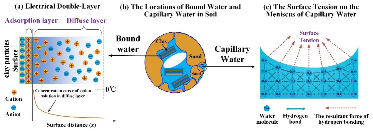 研究通過將電解質(zhì)溶液相變機(jī)制與雙電層理論相結(jié)合,構(gòu)建了凍土未凍水理論模型,定量刻畫了土壤鹽分(溶液濃度、溶質(zhì)種類及比例)、表面電荷密度、溫度以及土壤類型(比表面積)等因素對未凍水含量的影響,克服了傳統(tǒng)土水勢模型難以實(shí)現(xiàn)物理參數(shù)化的固有局限。
