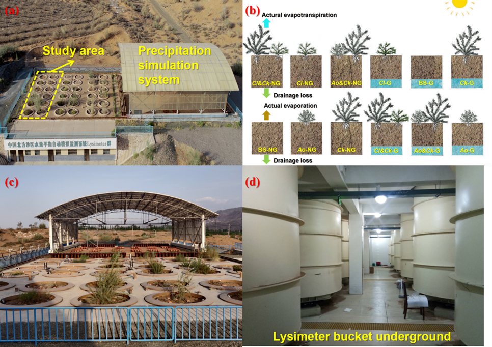 中國科學院西北生態(tài)環(huán)境資源研究院張志山研究員團隊,依托沙坡頭沙漠研究試驗站的“中國北方沙區(qū)水量平衡自動模擬監(jiān)測系統(tǒng)——沙坡頭蒸滲儀(Lysimeter)群”,采用其中12個大型稱重式蒸滲儀(填充土壤為騰格里沙漠的風沙土,從裸沙到多種單一栽植及灌木與半灌木混合栽植),系統(tǒng)量化了2019年至2023年間不同沙漠生態(tài)系統(tǒng)(有無地下水)的水量平衡組分及植物生長動態(tài)。