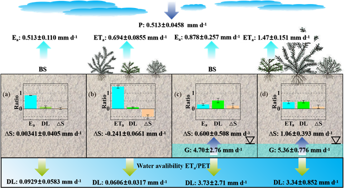 地下水與植物栽植對水量平衡各組分的影響。裸沙(a,c)和栽植植物的蒸滲儀(b,d)在無地下水條件(a,b)和有地下水條件(c,d)。Ea: 實際蒸發(fā)量;ETa: 實際蒸散發(fā)量;?S: 土壤水儲量變化;DL:滲漏量。