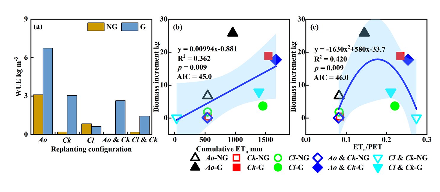 2020-2023年兩種地下水條件及不同植物配置下的水分利用效率(a),以及植物生物量增量變化與累積實際蒸散量 (b)和ETa/PET(c) 的關系。藍色陰影表示95%置信區(qū)間,PET:潛在蒸散發(fā)。