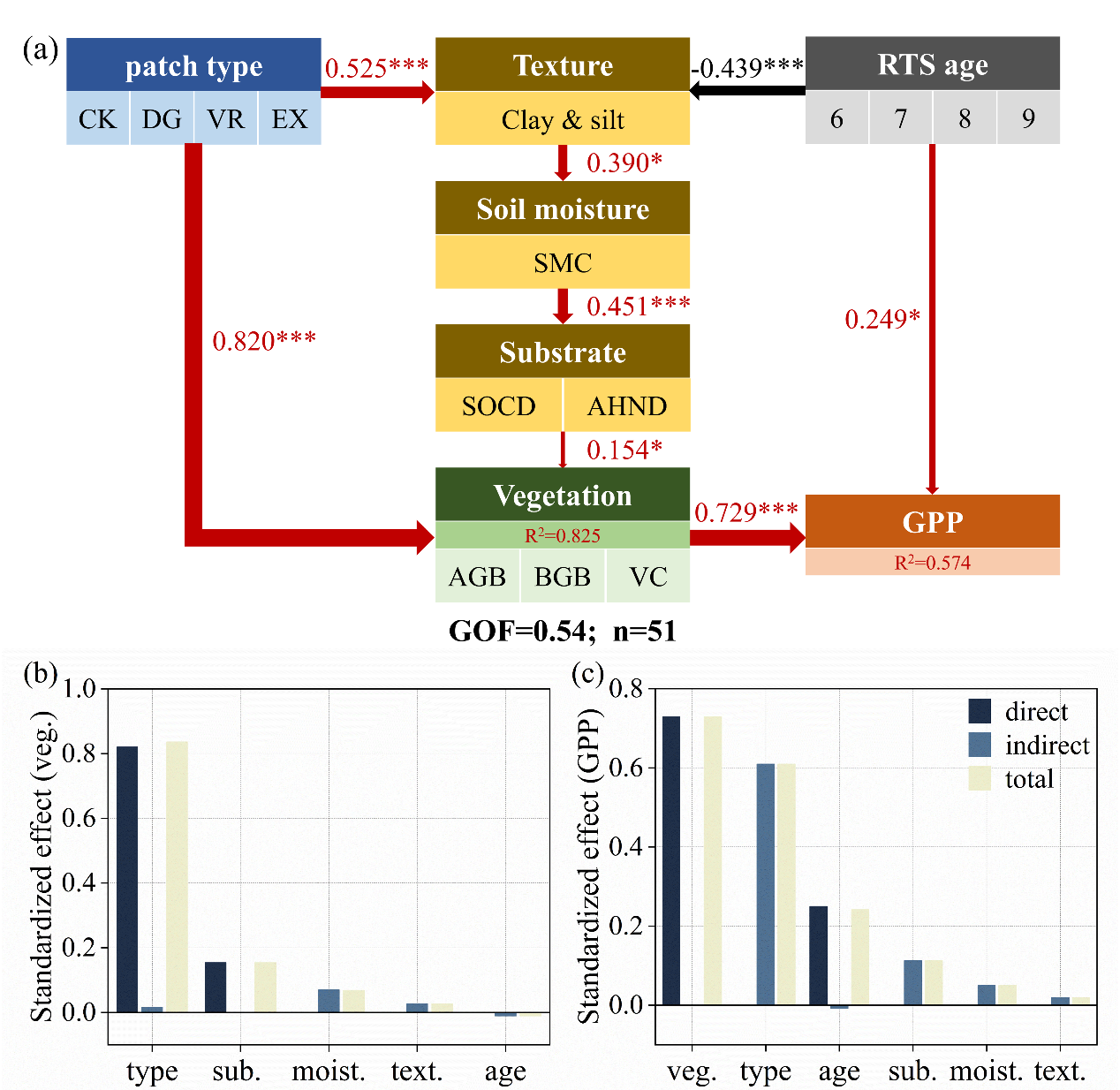 偏最小二乘路徑模型結(jié)果表明,熱融滑塌主要通過“土壤質(zhì)地-水分-基質(zhì)-植被-GPP”路徑影響青藏高原生態(tài)系統(tǒng)功能。其中植被對GPP的直接控制最強,滑塌年齡次之,土壤過程則更多通過調(diào)節(jié)群落結(jié)構(gòu)間接作用影響GPP。因此,在評估熱喀斯特地貌的碳效應(yīng)時,應(yīng)將滑塌地表類型及年齡組成納入考量。