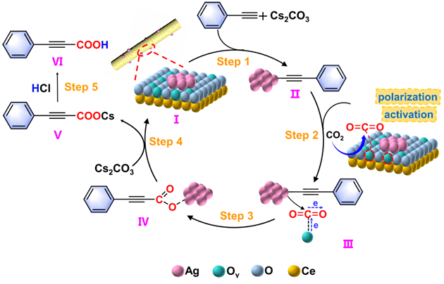 基于上述研究,對反應(yīng)機(jī)理做出了闡釋(見圖2),在Cs2CO3的協(xié)助下,苯乙炔中的酸性C(sp)-H鍵被去質(zhì)子化,形成末端炔基陰離子,同時(shí)與銀簇(Ag+)配位,生成銀炔中間體(II);CO2在CeO2表面的Ov位點(diǎn)上吸附并發(fā)生極化,通過對炔基的親電攻擊(III),活化的CO2插入到 C≡C---Ag 鍵中,生成羧酸銀中間體(IV),隨后用鹽酸酸化獲得產(chǎn)物苯丙炔酸(V-VI)。